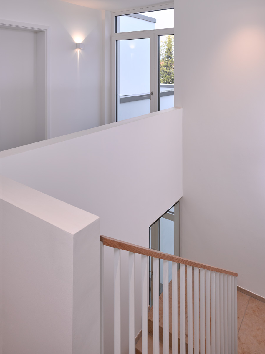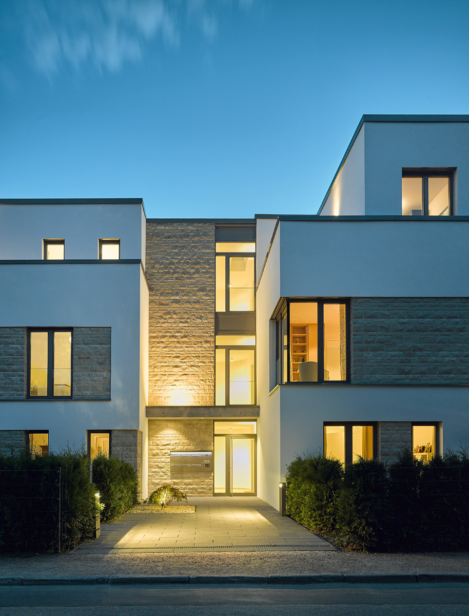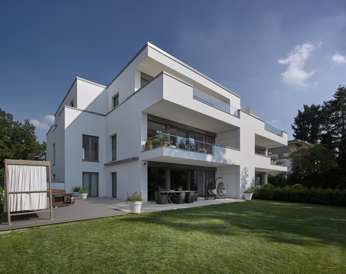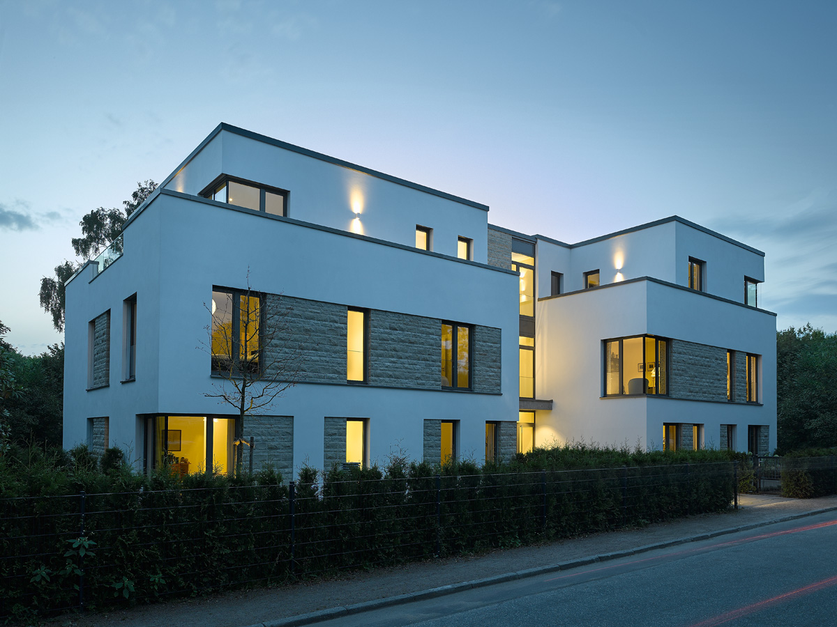 Das Gebäude erstreckt sich über zwei Vollgeschosse mit aufliegenden Penthouses und gut belichteten Souterrainbereichen. Die Wohnungen sind barrierefrei und variieren zwischen ca. 125 m² und ca. 240 m² Wohnfläche. Sie verfügen über große Westbalkone bzw. Terrassen mit integrierten Abstellräumen, hinzu kommen noch Lichthöfe für die Maisonettewohnungen im vorderen und seitlichen, sowie große Gartenanteile (ca. 250 m²) im rückwärtigen Bereich.