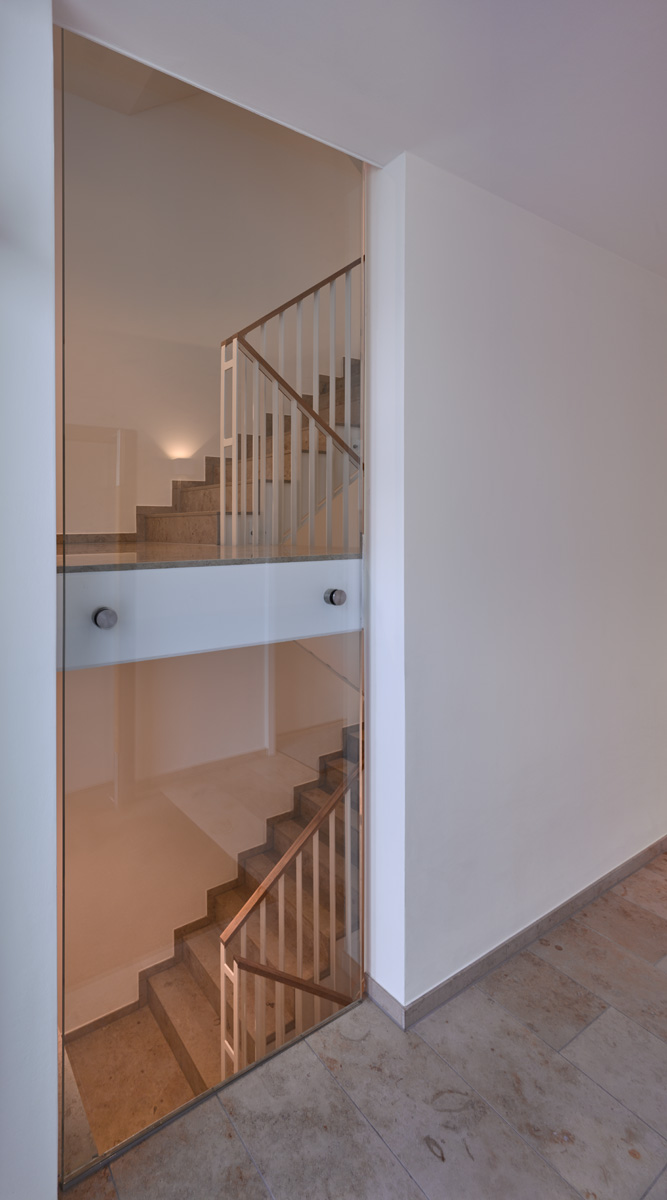 Eine Tiefgarage mit 12 großzügigen Stellplätzen (Breite je ca. 3 m) ist direkt mit dem Fahrstuhl erreichbar, wobei die Maisonettewohnungen zusätzlich eigene Zugänge im Souterrainbereich haben. Im Untergeschoss befinden sich sämtliche Kellerräume, der Gemeinschaftsfahrradkeller und der Technikraum. Alle Etagen und die Tiefgarage sind über einen edlen Fahrstuhl mit weißen Glaspaneelen zu erreichen.